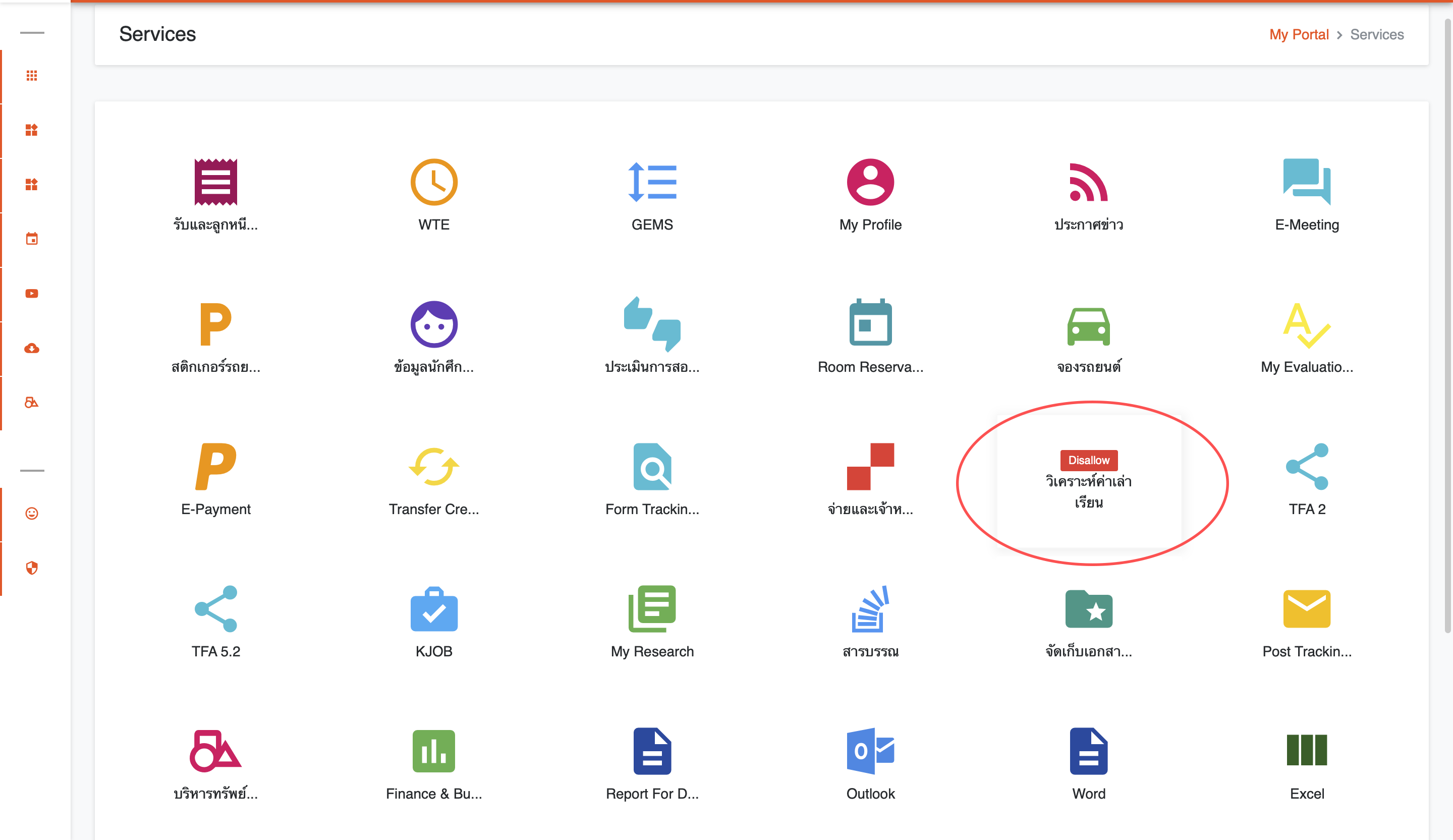 เนื่องจากบางระบบมีการกำหนดสิทธิ์การเข้าใช้งานให้เฉพาะบุคคล กลุ่มบุคคล หรือบางหน่วยงานเท่านั้น ทำให้ใน My Portal จะมองเห็นระบบดังกล่าวเป็น Disallow และไม่สามารถคลิกเข้าสู่ระบบได้ หากท่านใดต้องการใช้งานระบบให้ท่านทำการติดต่อผู้ดูแลของระบบนั้นๆ เพื่อทำการเพิ่มสิทธิ์การใช้งาน