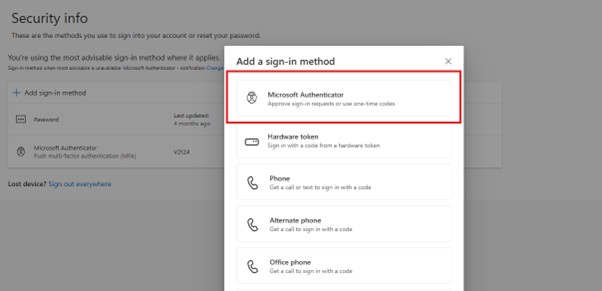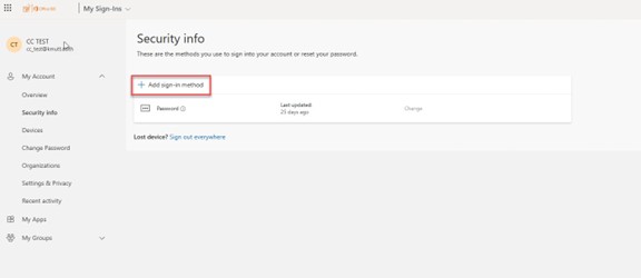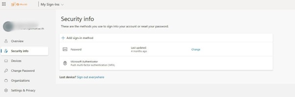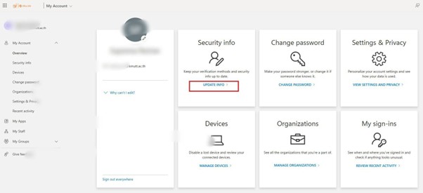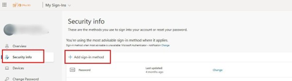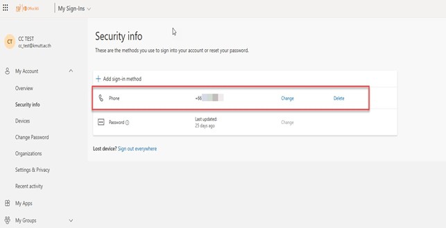 2. ตั้งค่า MFA: เข้าไปตั้งค่าวิธีการยืนยันตัวตนผ่านหน้า Security Info ของบัญชี Microsoft ที่ https://mysignins.microsoft.com/security-info