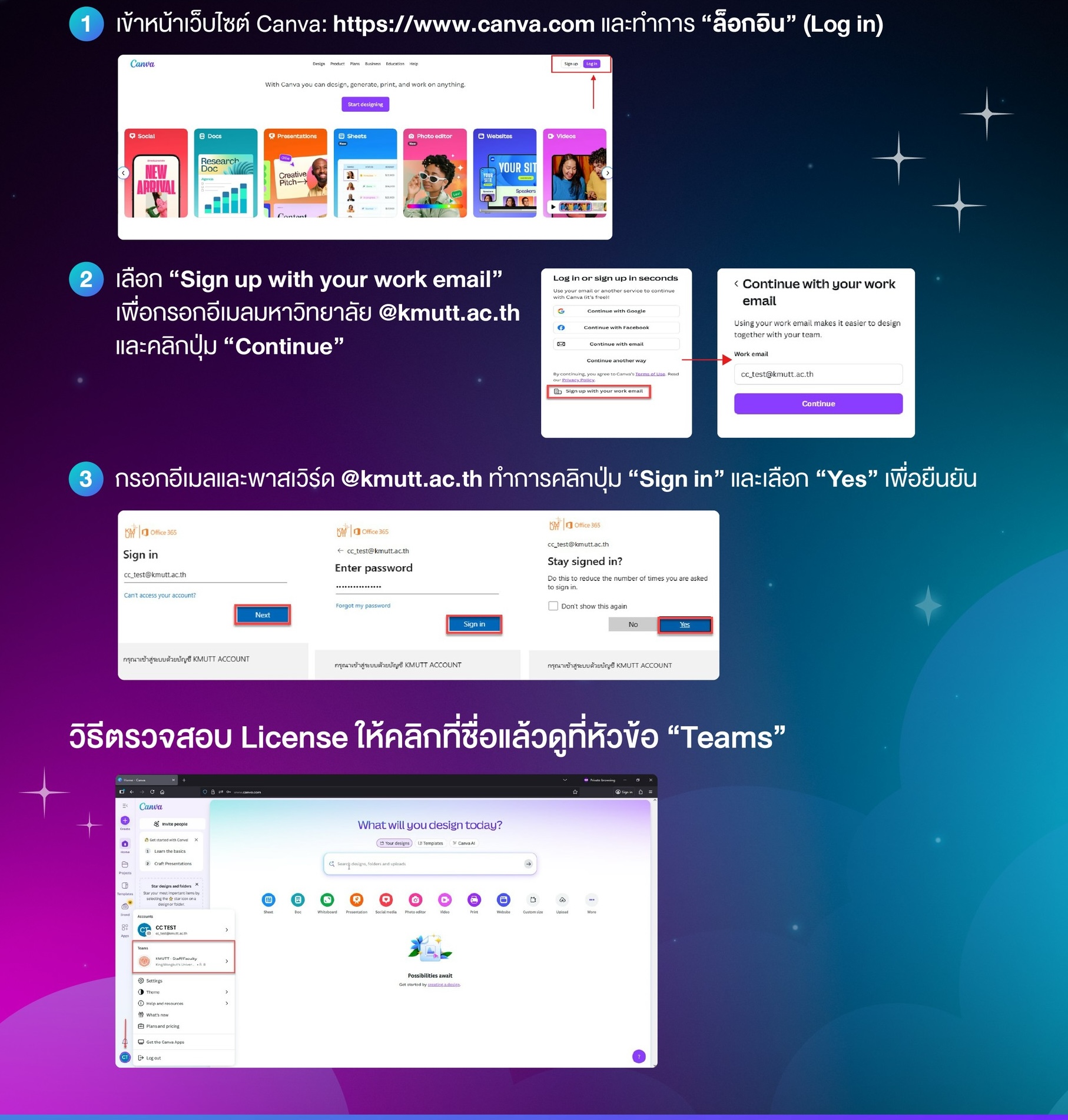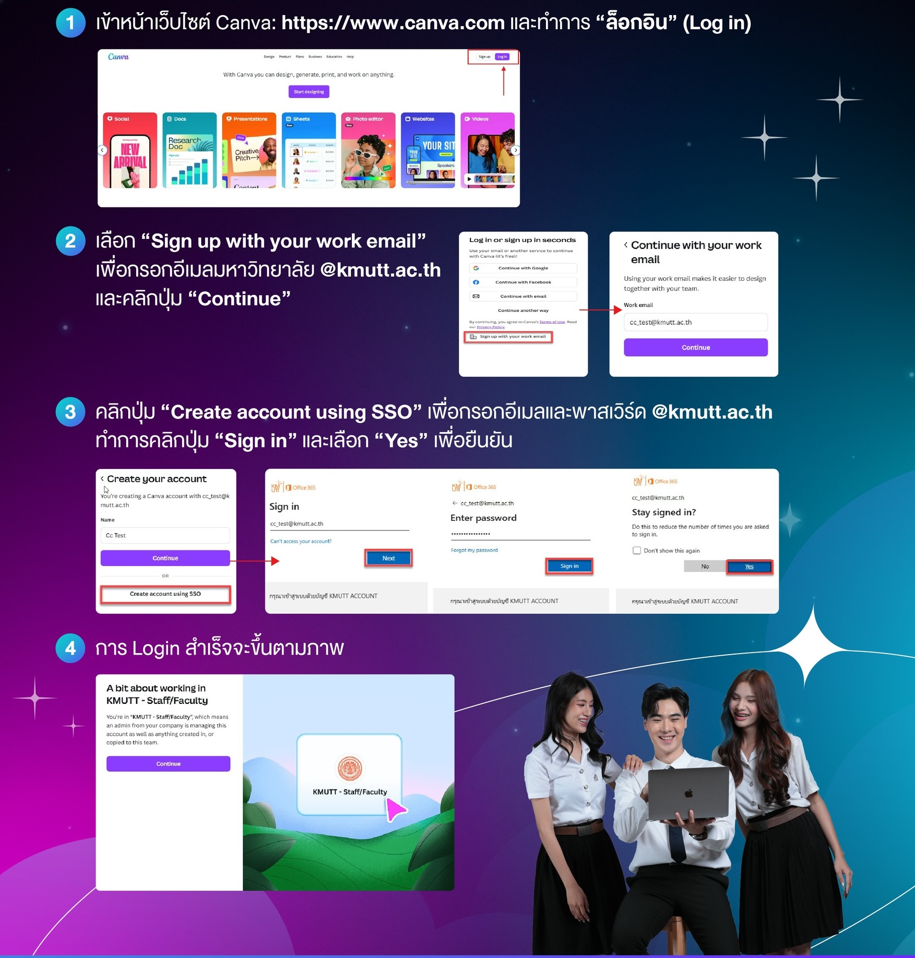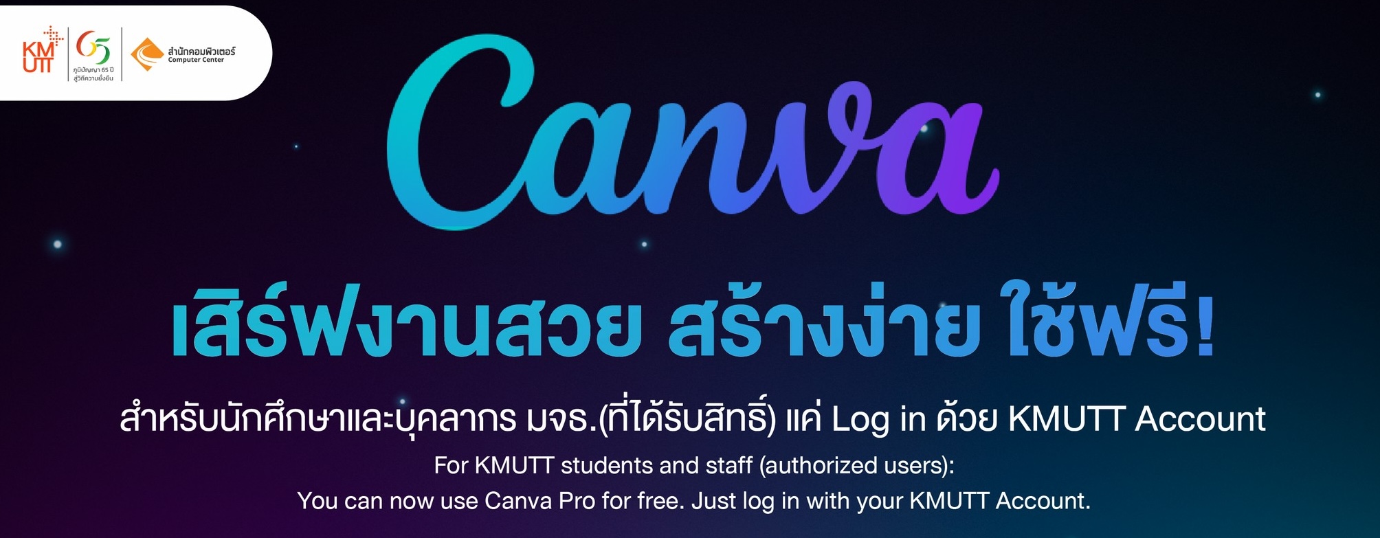 เพียงเข้าสู่ระบบด้วย KMUTT Account (อีเมลที่ลงท้ายด้วย @kmutt.ac.th) ก็สามารถใช้งาน Canva ได้ฟรี! ไม่ว่าจะเป็นการออกแบบโปสเตอร์ รายงานนำเสนอ อินโฟกราฟิก วิดีโอ ไปจนถึงสื่อประชาสัมพันธ์ในรูปแบบต่าง ๆ Canva จะช่วยให้คุณสร้างผลงานที่โดดเด่นได้ง่ายเพียงไม่กี่คลิก